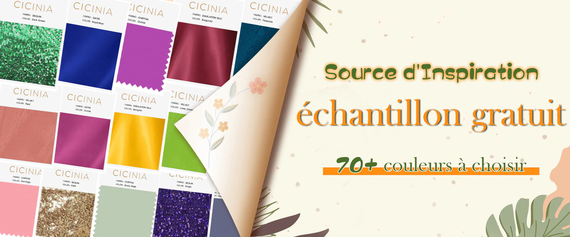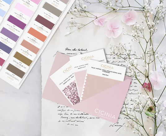 Commandez d'abord les échantillons de couleurs. Choisissez les couleurs qui correspondent le mieux au thème de votre mariage et trouvez vos tissus préférés.