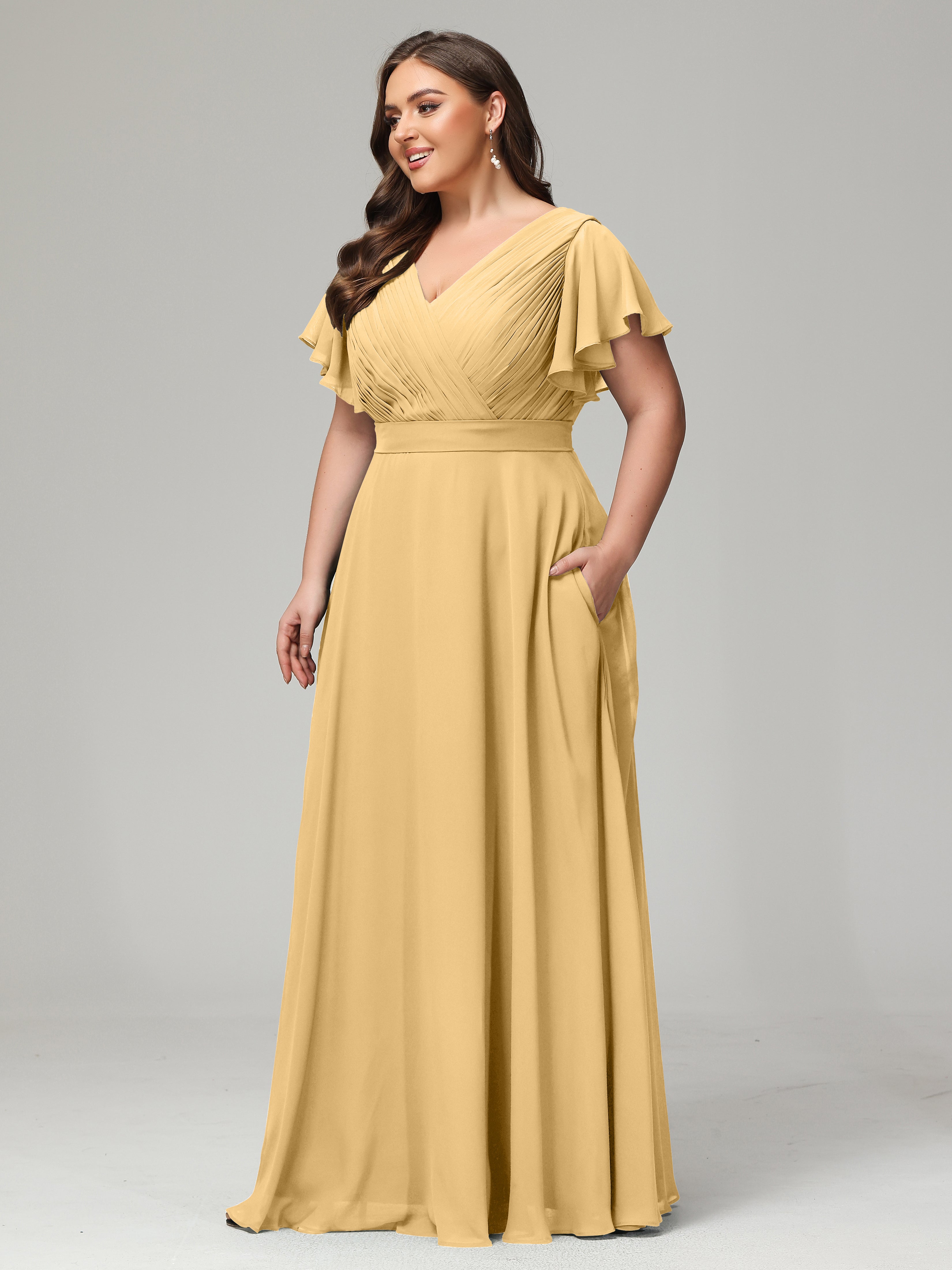 Demoiselle D Honneur Doré Grande Taille Dos En V Manches Courtes Mousseline