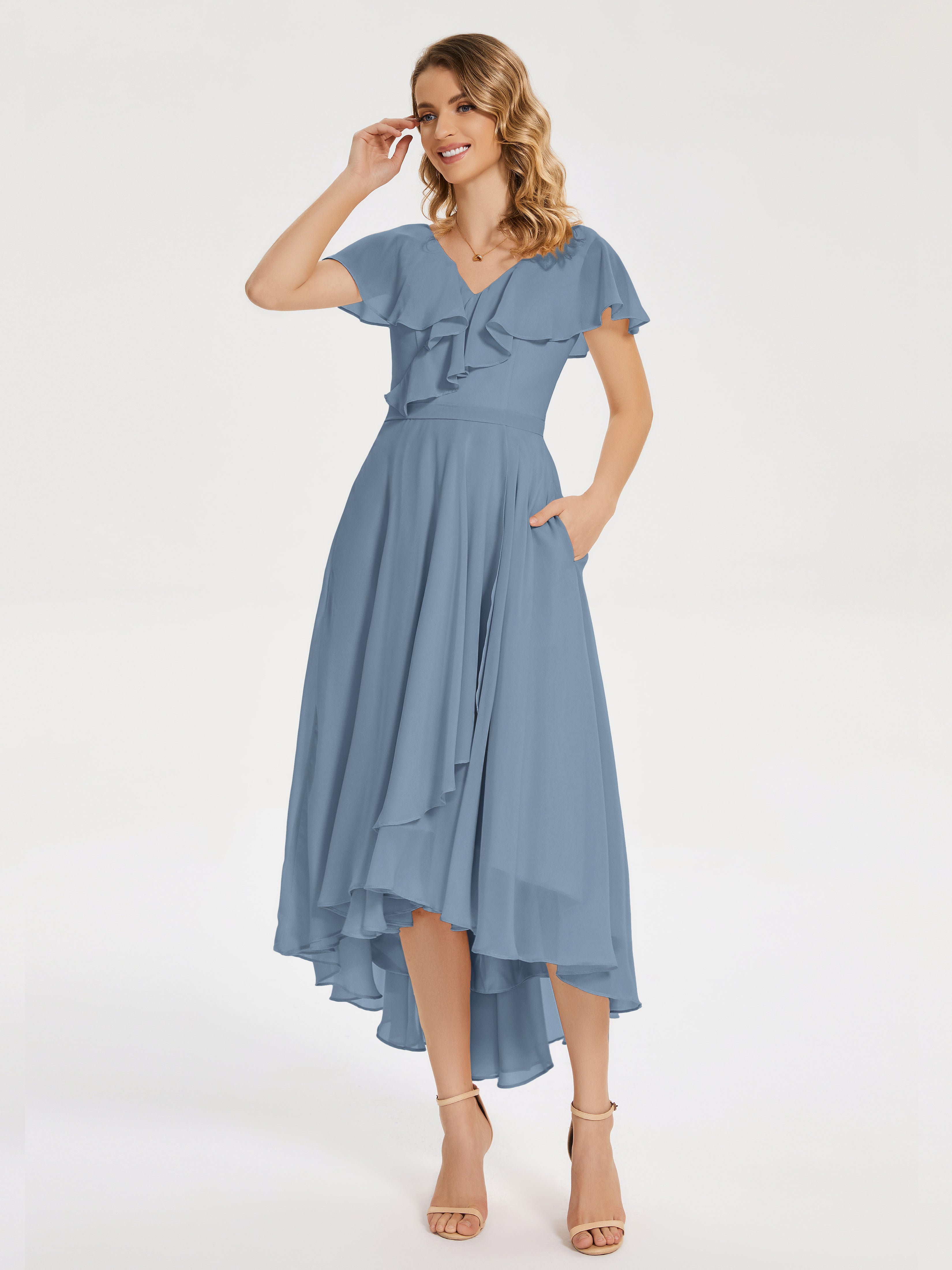Robes De Demoiselle D'Honneur Bleu De Schiste Col V Asymétrique Robes Demoiselle D'Honneur À Volants