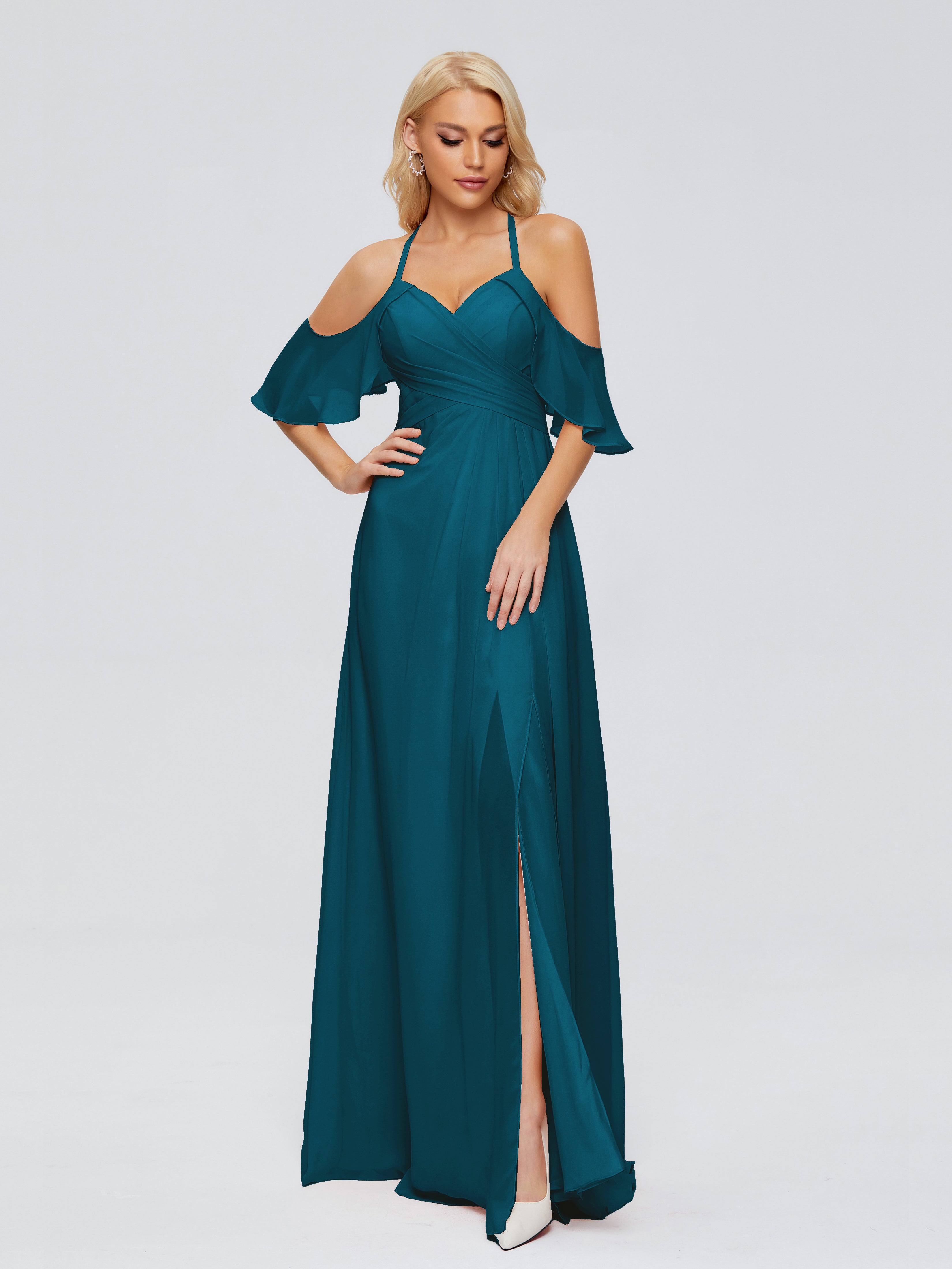 Robes De Demoiselle D'Honneur Bleu Encre Trapèze Fendue Devant Mousseline Robes Demoiselle D'Honneur