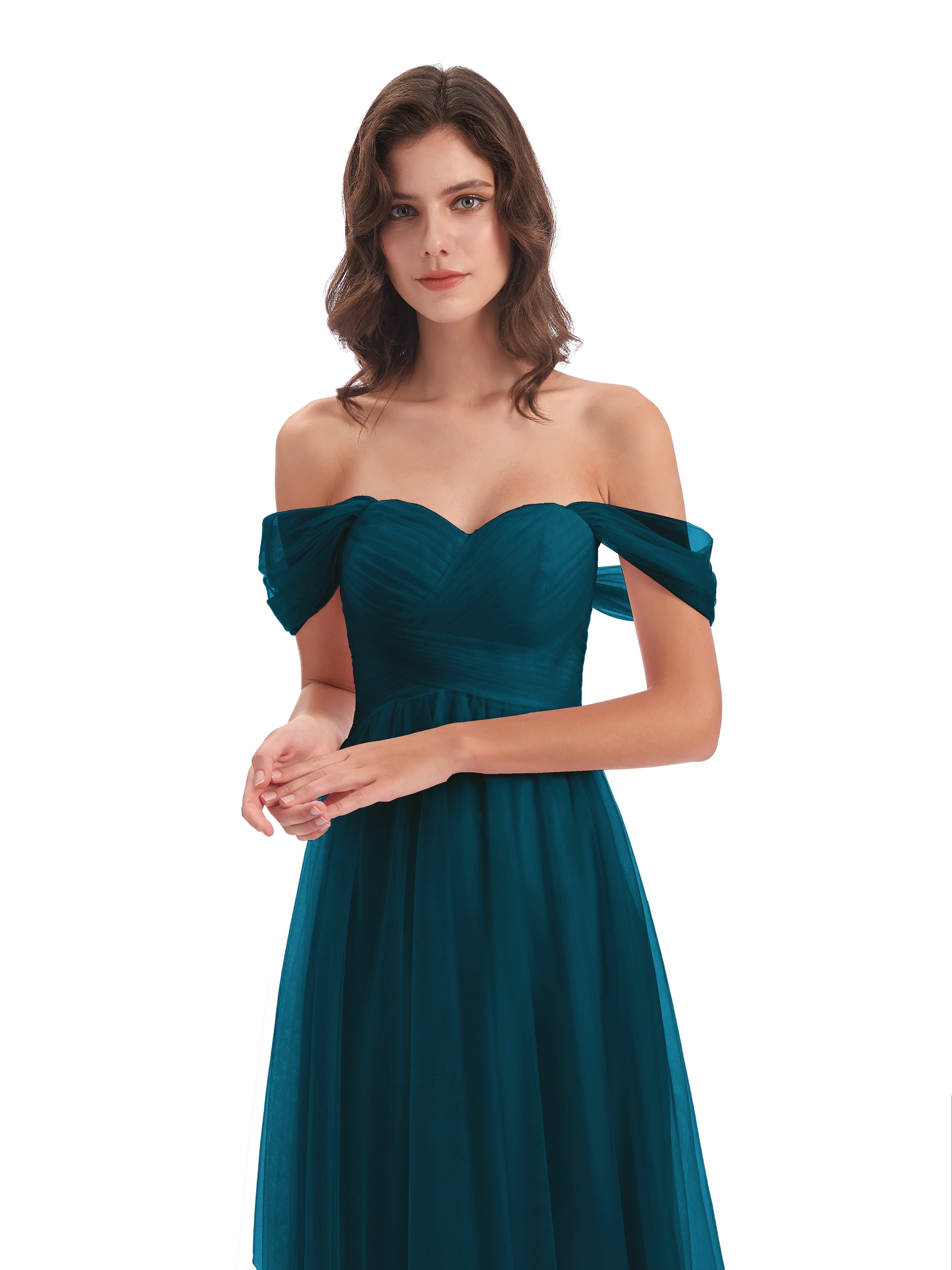 Robes De Demoiselle D'Honneur Bleu Encre Trapèze Hors-La-Épaule Tulle Longue Robes Demoiselle D'Honneur