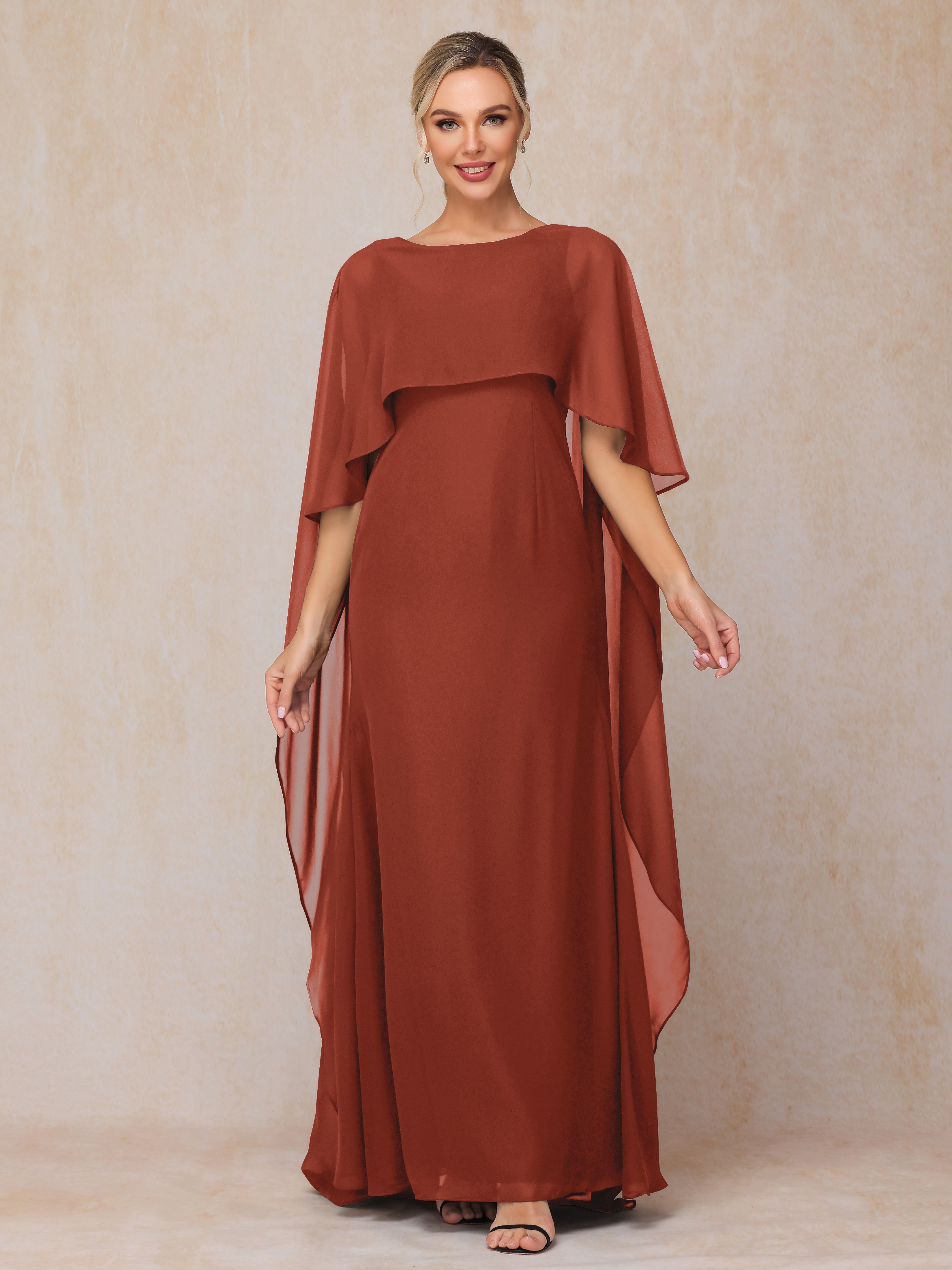 Cette magnifique robe trapèze en mousseline de soie est parfaite pour toutes les mères de la mariée. Son élégant col bateau et son dos ouvert ajoutent une touche de sophistication tandis que la cape légère offre une couverture supplémentaire. Faites sensation le jour du mariage avec cette robe à la fois confortable et chic.